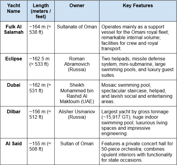 Below is a comparative table of the five largest yachts in the world (after the Azzam), highlighting their length, owners, and most notable features.